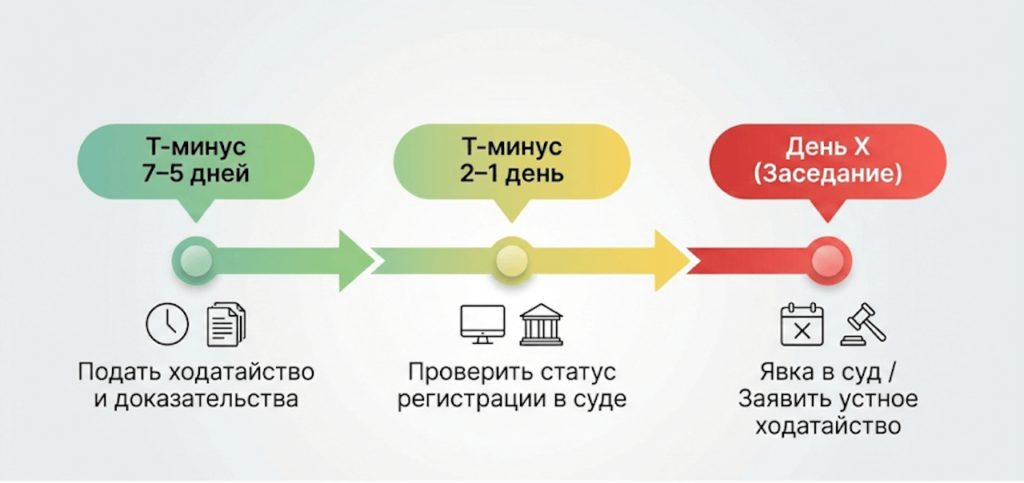 Тактика переноса заседания строится на добросовестности и минимизации сомнений суда в затягивании. Один сильный аргумент с документом обычно эффективнее нескольких слабых ссылок.